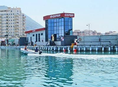 On Tuesday we took Interlude to the fuel wharf in Gib and loaded 1100 liters of diesel at 64 pence/liter ($US 3.75/gal). This was at the brand new Cepsa station (BP was 0.62 L/l, Shell 0.69 L/l). We also got fuel and oil for the dinghy. After re-anchoring off La Linea we took the dinghy back to Gib and visited some friends in Ocean Village/Marina Bay (VHF 71, +350 200 73300). We were allowed to visit within the marina compound but not go into town. To properly cross the border from Spain requires walking thru a checkpoint and across the airport runway.